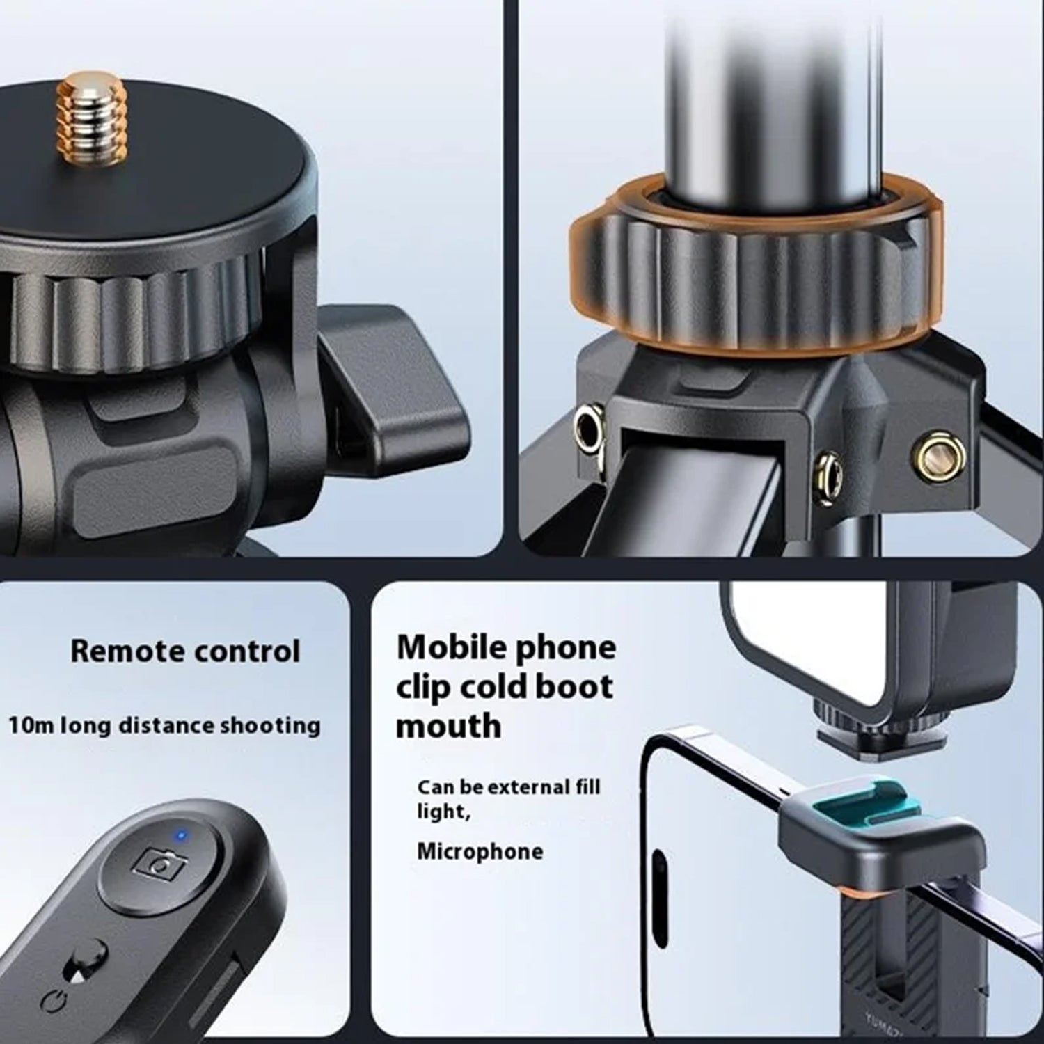 360° Rotatable Head & Adjustable Phone Clamp:- Equipped with a fully adjustable head, this tripod stand for phone 360 rotation allows complete horizontal 360° movement and vertical tilt adjustment.