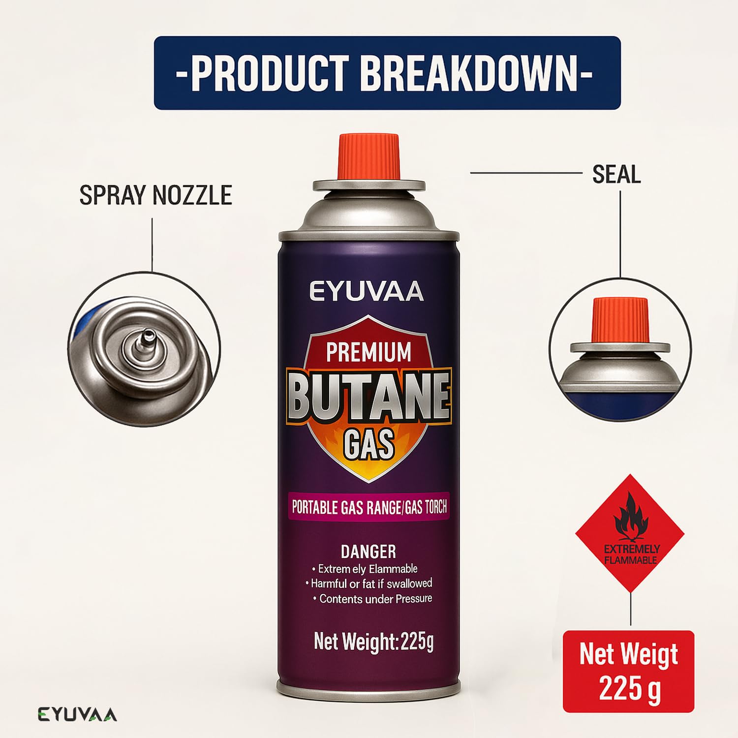 ✅SAFE AND RELIABLE PORTABLE BUTANE GAS - Safety meets reliability with Eyuvaa’s premium butane fuel canisters, featuring an advanced self-sealing nozzle to prevent leaks and ensure secure storage and transport. Designed for worry-free use in camping stoves.
