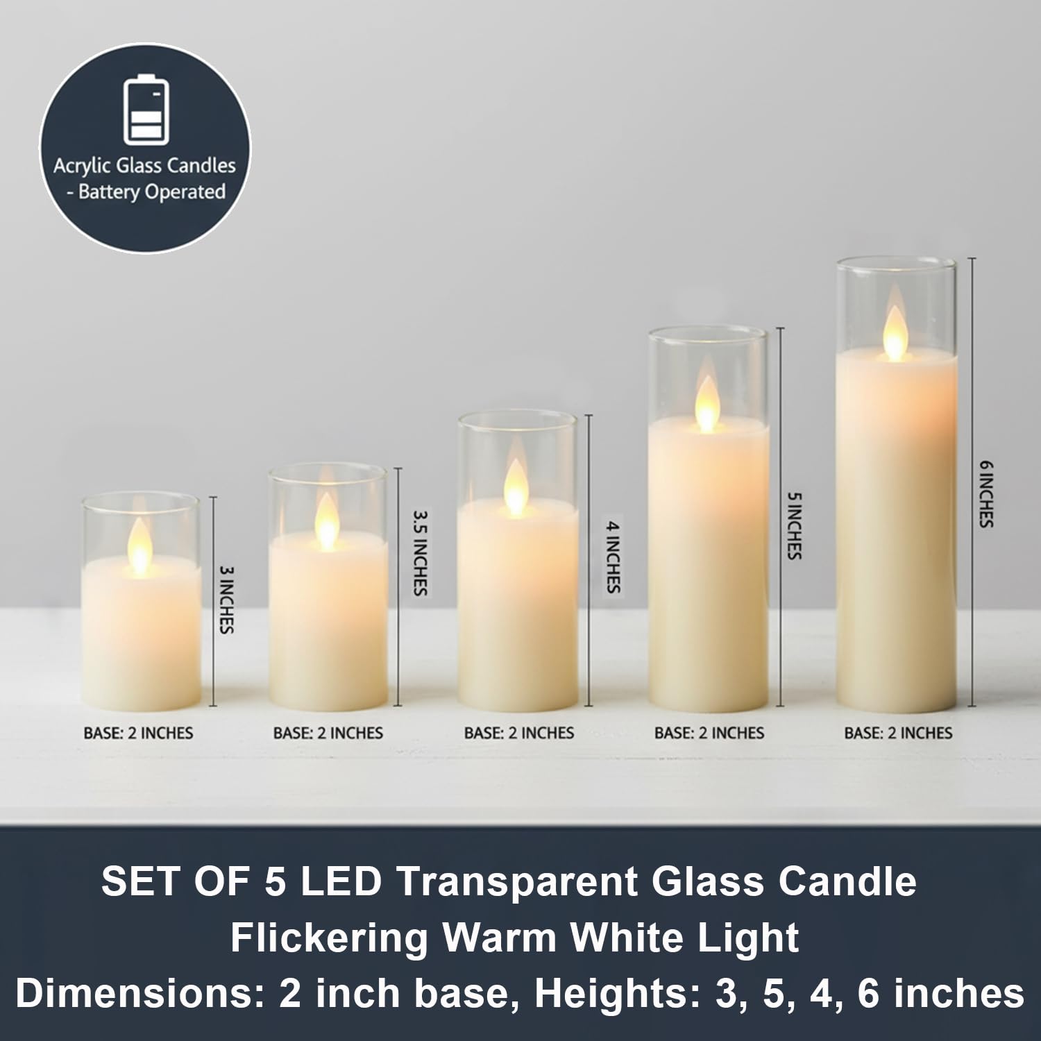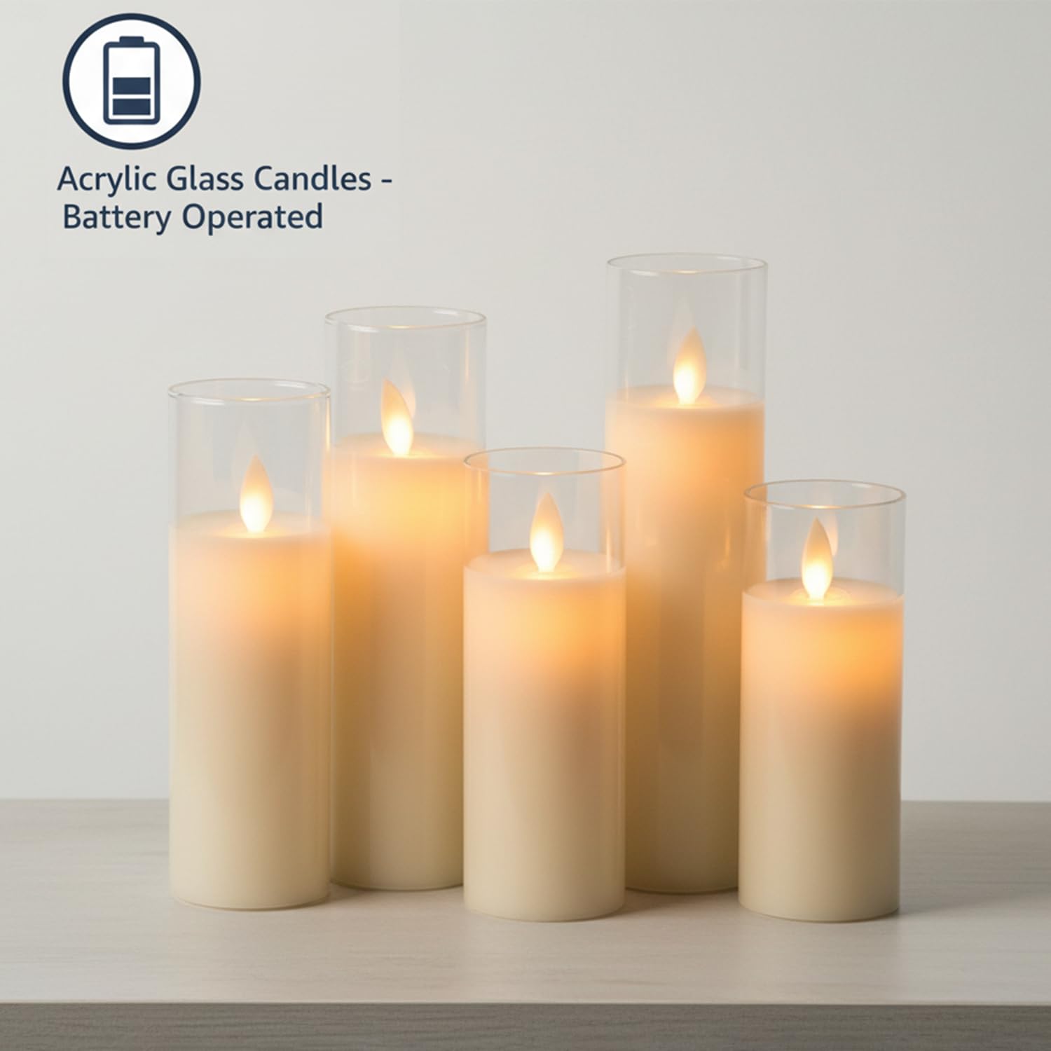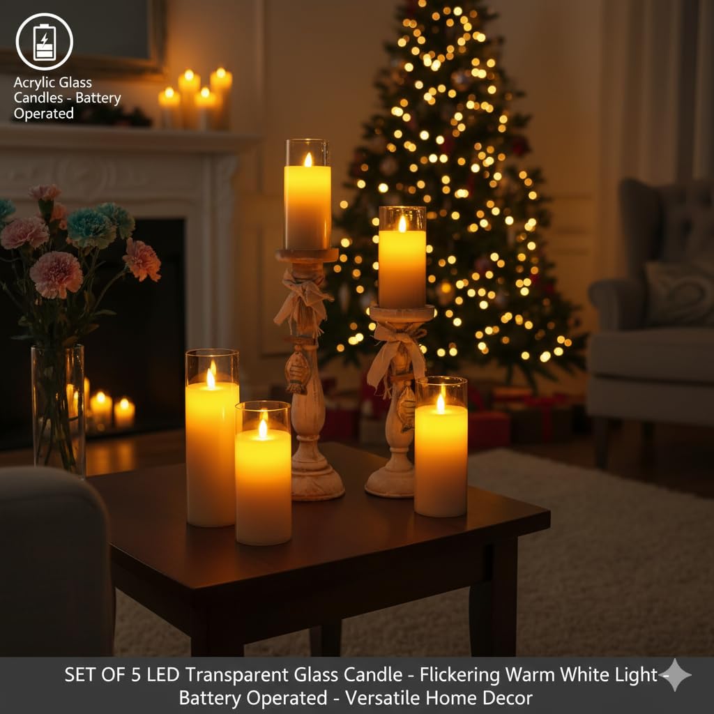 EYUVAA Flickering LED Flameless Candles, Battery Operated Acrylic Glass Candle Set, Moving Wick Candle for Home Décor, Wedding, Party, Diwali Decoration (Set of 5)