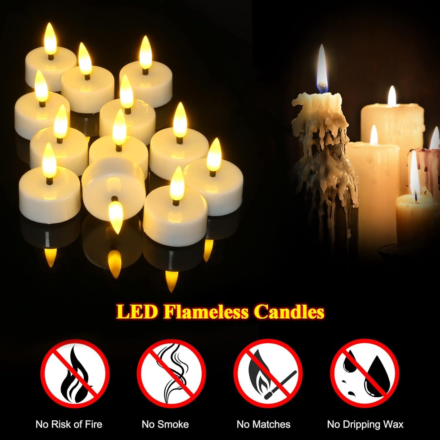 ✅SAFE FLAMELESS CANDLES – NO SMOKE, NO WAX, NO FIRE RISK:- Unlike traditional wax candles, EYUVAA flameless LED tea lights are smoke-free, dripless, and mess-free. No open flame, no heat, no soot — making them safe for kids, pets, elderly family members, restaurants, hotels, events, and indoor home decoration.