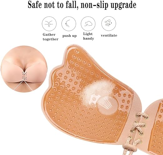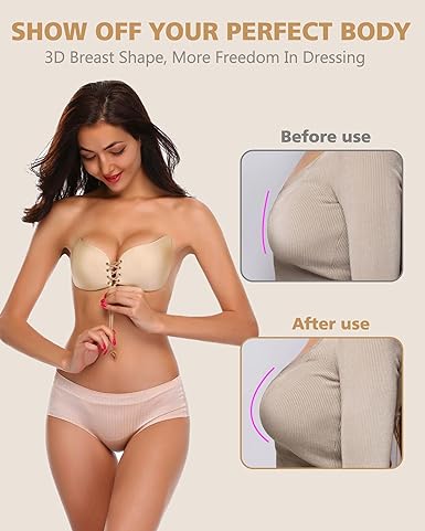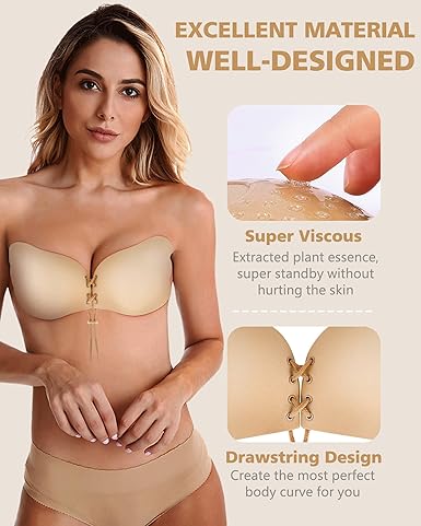✅Invisible Lift Up Bra: Effortlessly gather and lift with our sticky bra for women. This self-adhesive, one-piece 3D cutting bra wraps the chest, pushing fat towards the front for a lifted look. The nude and white strapless bra offers stability with its thin top and thick bottom. Adjustable drawstrings provide elasticity and a sexy, scientific fit.